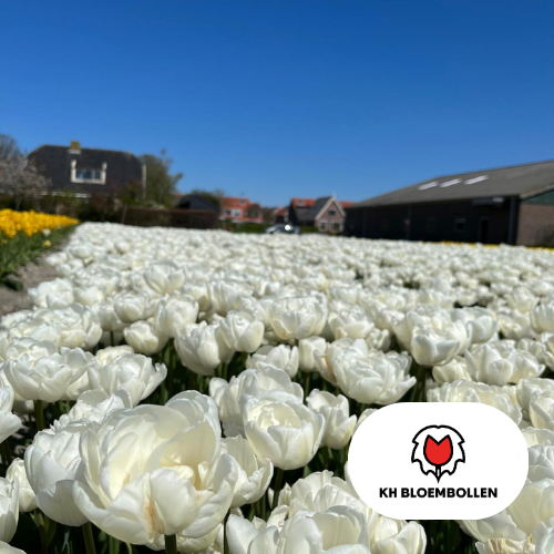 De Double White tulp is een prachtige dubbelbloemige tulp met grote, volle bloemen in een zuivere witte kleur. Door de vele bloemblaadjes heeft deze tulp een luxe en elegante uitstraling die doet denken aan een pioenroos. De frisse witte bloemen zorgen voor een stijlvolle en rustige sfeer in de tuin en passen perfect in zowel moderne als klassieke borders.
